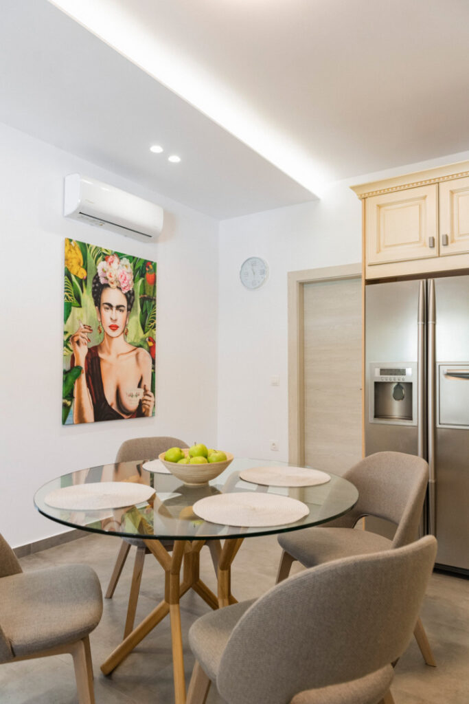 Ο παραδοσιακός σχεδιασμός συνδυάζεται άψογα με τα τοπικά έργα τέχνης σε έναν καθαρό, εκλεπτυσμένο χώρο. Μια γενναιόδωρη τραπεζαρία προσκαλεί σε εύκολες συγκεντρώσεις, ενώ η πλήρως εξοπλισμένη κουζίνα -με μεγάλο ψυγείο και συσκευές Smeg- κάνει το μαγείρεμα απλό και ευχάριστο.