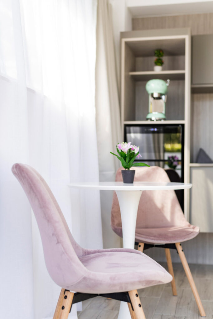 Fully equipped kitchenette with essential kitchenware, dining table with chairs, coffee machine, electric kettle, refrigerator, full set of dishes and utensils